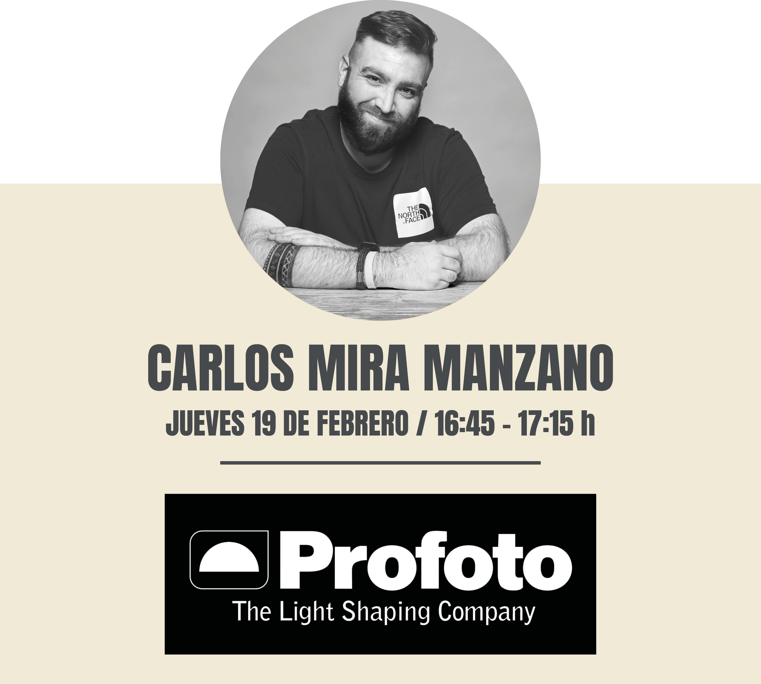 Carlos Mira Manzano es un fotógrafo profesional especializado en retrato (corporativo, editorial y personal), marcas, producto e infantil, también es profesor y coach de fotografía, colaborando con marcas como Nikon y Profoto y enseñando en instituciones como Nikon España y la UFV. Es conocido por transmitir una visión artística y personal a través de sus trabajos, combinando técnica con una pasión por la enseñanza y el desarrollo de habilidades fotográficas en otros.